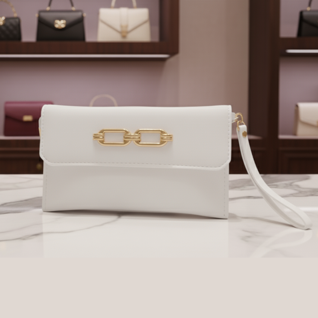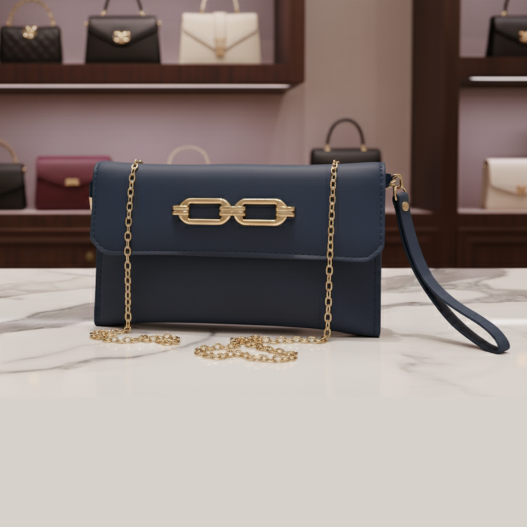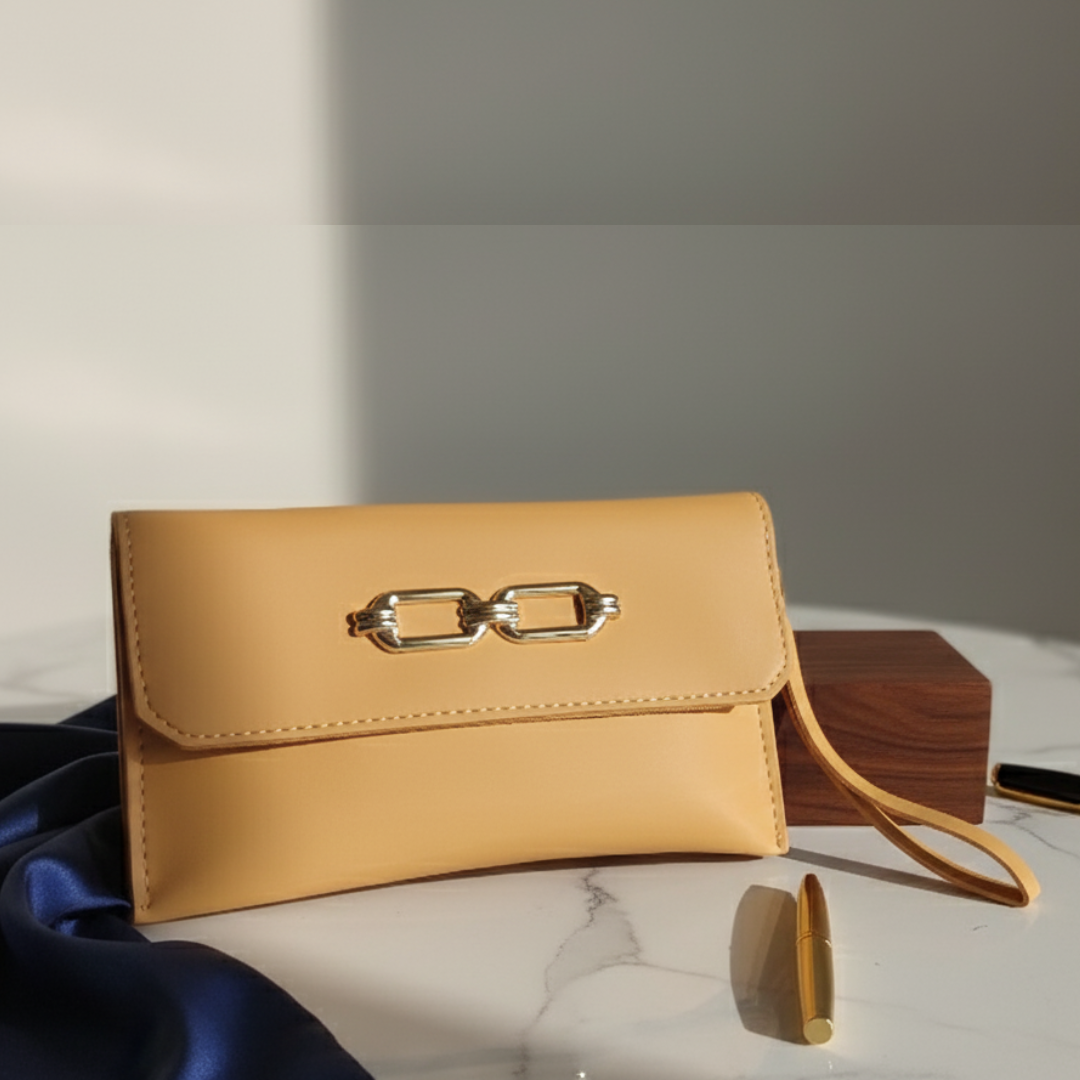 This quirky pouch features a single zippered compartment and a long golden chain for versatile wear as a crossbody.
