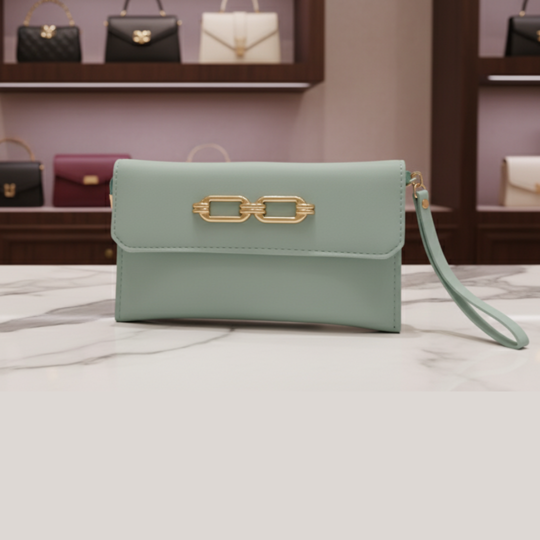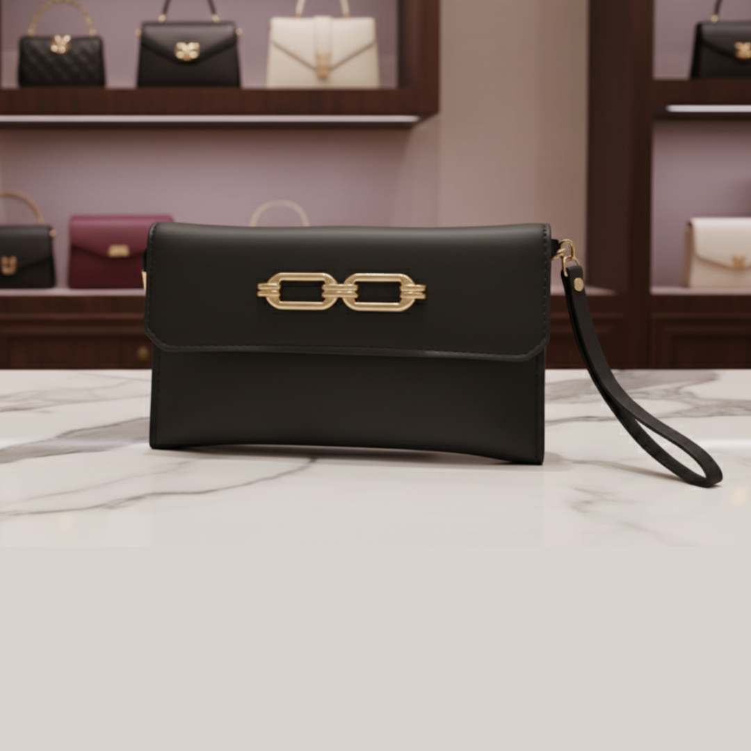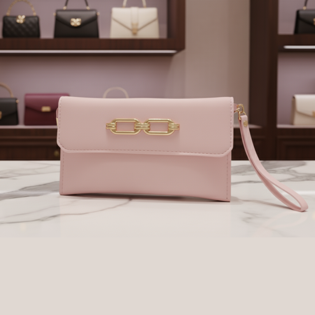 This quirky pouch features a single zippered compartment and a long golden chain for versatile wear as a crossbody.